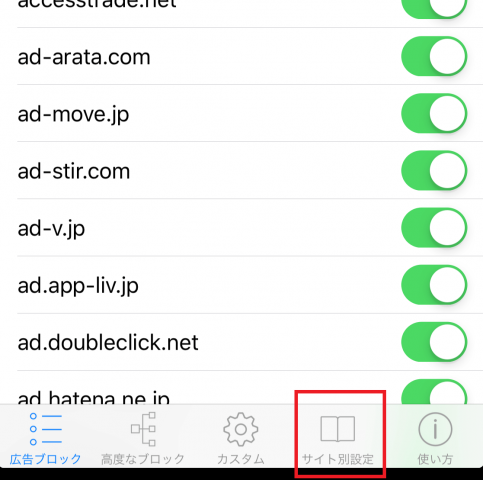 ①AdFilterを開き、下部メニューにある「サイト別設定」を選択する