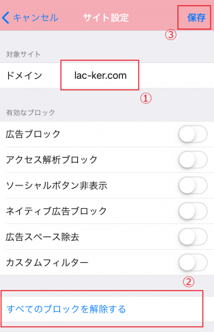 ②右上の+マークを押し、ドメイン入力後「すべてのブロックを解除する」を選択して保存する